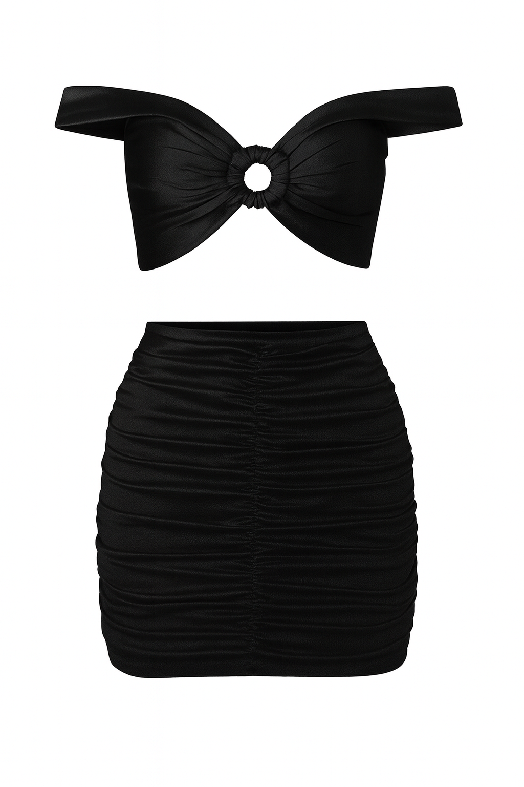 Асиметричният топ с декоративен ринг и отворен гръб създава смел, но елегантен силует, а полата с висока талия и цепка подчертава краката и осанката. Перфектен за прехода между късно лято и ранна есен, ALICÉ комбинира стил и увереност в едно завладяващо присъствие.